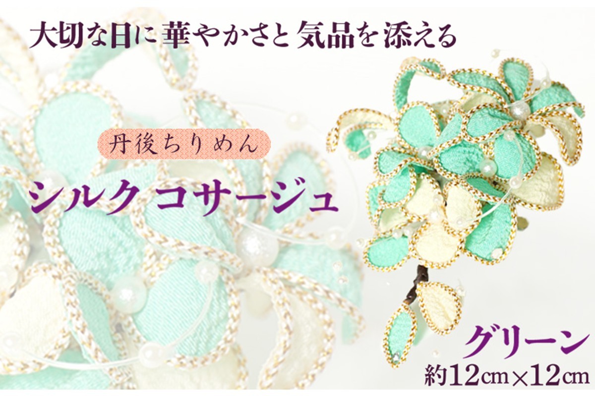 シルクコサージュ!(グリーン)着物などの和装・洋装共に使えます。髪飾りコサージュとしても! シルクコサージュ グリーン コサージュ 髪飾り ヘアアクセサリー 入学式 卒業式 フォーマル セレモニー ハンドメイド AM00291