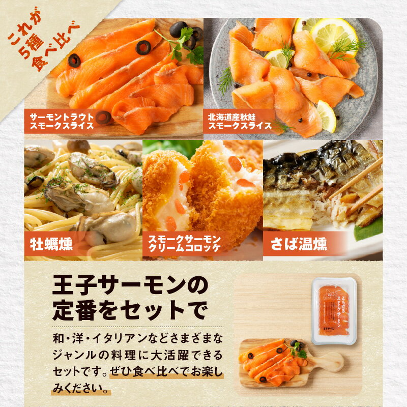 - 【ふるさと納税】 王子サーモン スモークサーモン等 5種 食べ比べ セット サーモントラウト 秋鮭 鮭 シャケ さけ サーモン スライス スモーク 燻製 牡蠣燻 牡蠣 クリームコロッケ コロッケ さば温燻 鯖 さば 惣菜 北海道 苫小牧市 おすすめ ランキング プレゼント ギフト