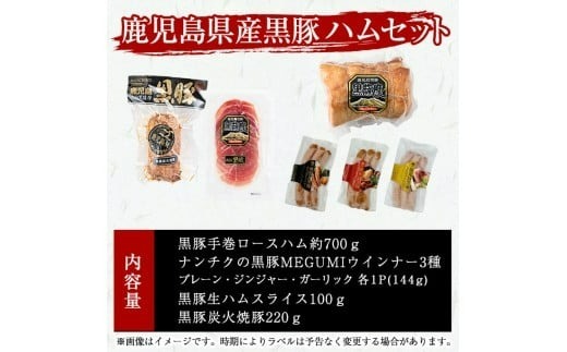 - 豚の飼養頭数日本一!鹿児島県産黒豚ハムセット1.4kg超!(黒豚手巻ロースハム約700g・黒豚黒豚MEGUMIウインナー3種 プレーン・ジンジャー・ガーリック各1P(144g)・黒豚生ハムスライス100g・黒豚炭火焼豚220g) b2-028