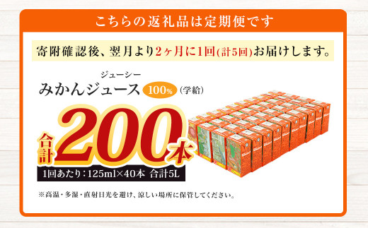 - 【2ヶ月毎5回定期便】 ジューシー みかんジュース 100% (学給) 125ml×40本 みかん ミカン 蜜柑 ジュース オレンジジュース 飲料 紙パック 国産 熊本県