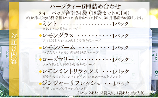 - 3か月定期便 さわやかハーブティー6種の詰め合わせセット 合計54袋 - お茶 ティーバッグ 茶葉 レモングラス ミント レモンバーム 生姜 ローズマリー ギフト ハーブ Wgr-0110