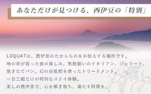 ロクワット 西伊豆 LOQUAT 土肥温泉 蔵一棟貸し 露天風呂付 客室 宿泊券 2名様(1泊2食付き) ※1日 2組様 限定【 静岡県 伊豆市 ペア カップル 宿泊 温泉 温泉宿 旅行クーポン 静岡 伊豆 蔵 限定 贅沢 ジェラテリア ベーカリー ラグジュアリー 名家 ⽩枇杷 地産地消 】 60-003