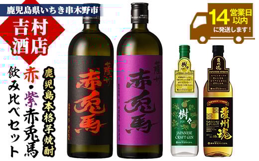 本格焼酎「赤兎馬」720ml「紫赤兎馬」720ml「薩州魂(スピリッツ)」700ml「樹々(クラフトジン)」700ml 各1本 飲み比べセット! 鹿児島焼酎 濵田酒造 薩州 赤兎馬 焼酎 ロック【B-262H】