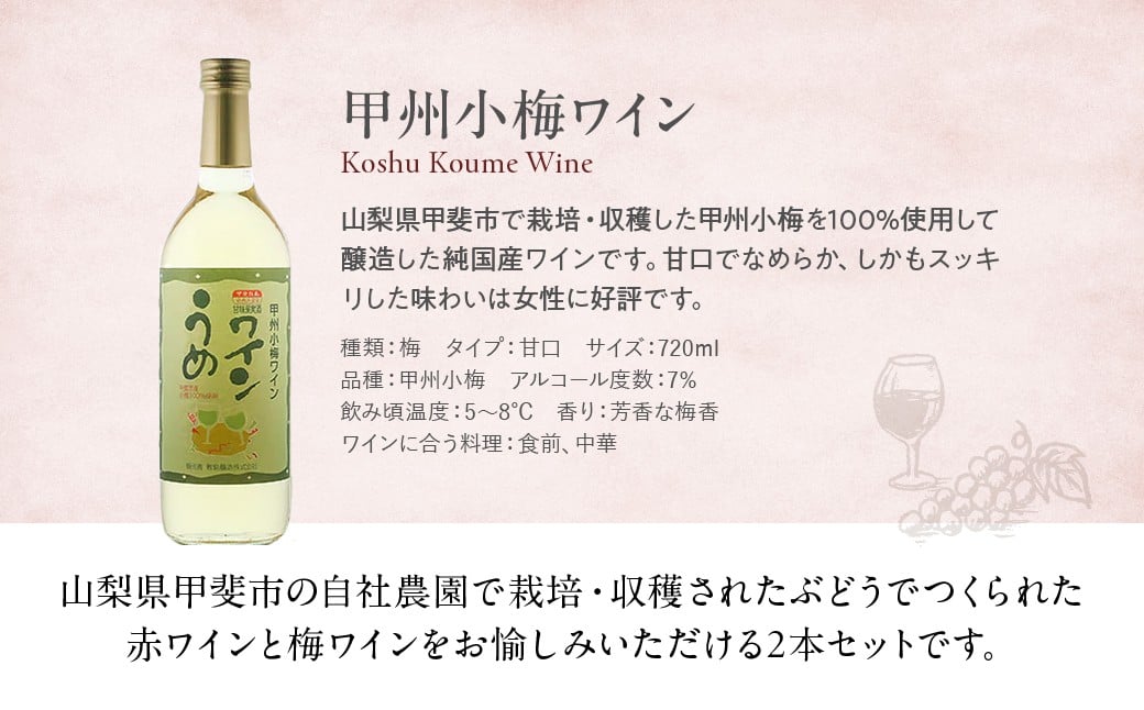 【敷島 赤 & 甲州小梅ワイン】720ml × 2本 セット 敷島醸造 赤ワイン わいん 梅ワイン ワインセット 国産ワイン 日本ワイン ミディアム 飲み比べ 甘口 山梨 甲斐市 F-2
