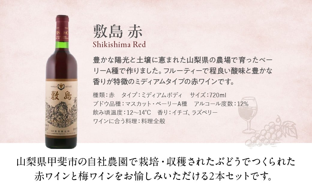 - 【敷島 赤 & 甲州小梅ワイン】720ml × 2本 セット 敷島醸造 赤ワイン わいん 梅ワイン ワインセット 国産ワイン 日本ワイン ミディアム 飲み比べ 甘口 山梨 甲斐市 F-2