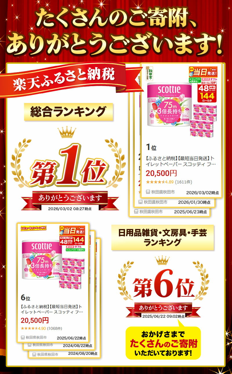 スコッティの「フラワーパック 3倍長持ちトイレットロール ダブル(香りつき)」が4 セット届く返礼品です。通常の3倍の長さで、省スペースに貢献。取り替え頻度が減り、持ち運びも楽ちんです。エンボス加工が施されていてふっくらとした優しい肌あたりです。