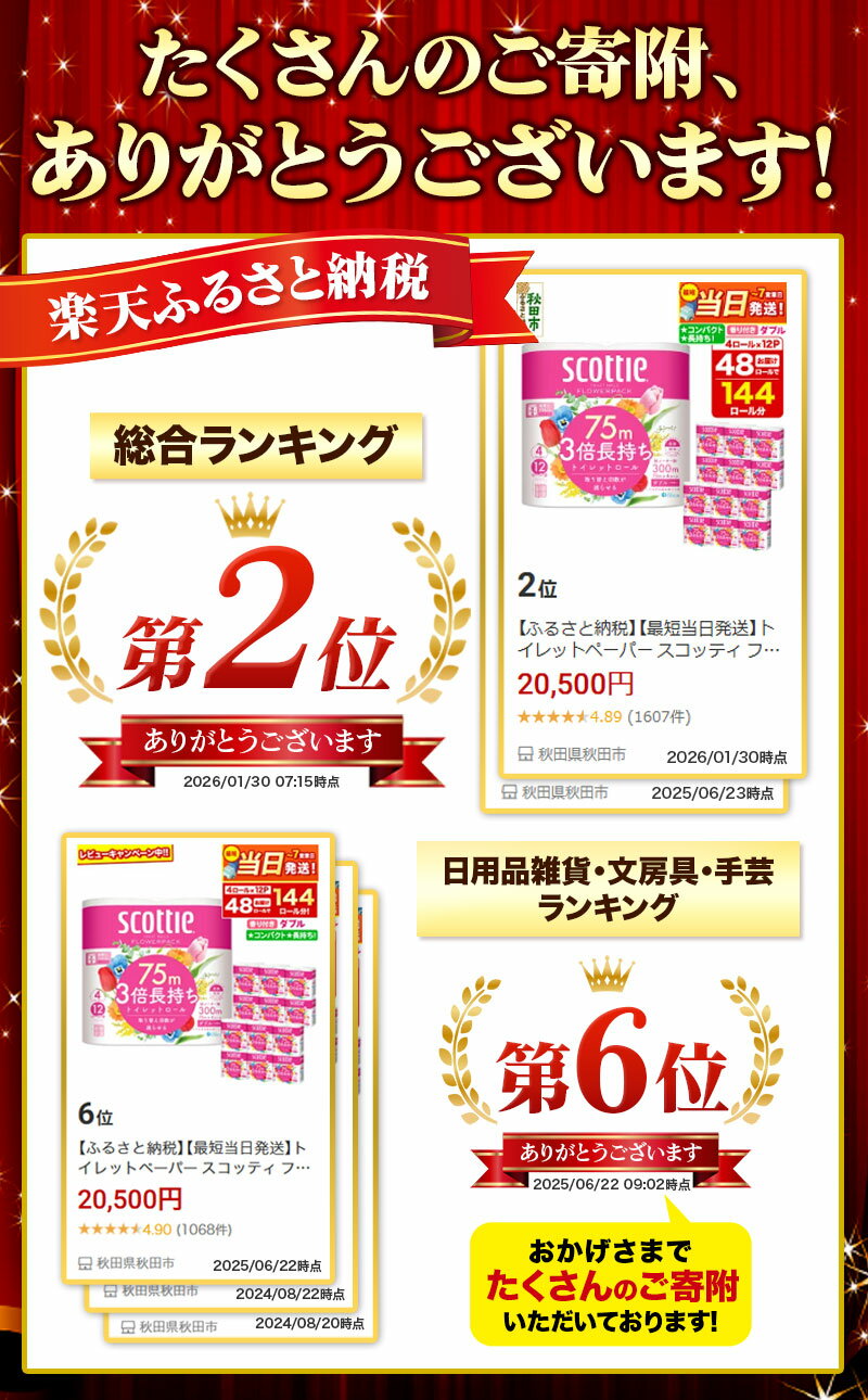 【ふるさと納税】《6ヶ月ごとに2回お届け》定期便 スコッティ フラワーパック 3倍長持ち 4ロール(シングル)×1パック 秋田市オリジナル 最短翌日発送