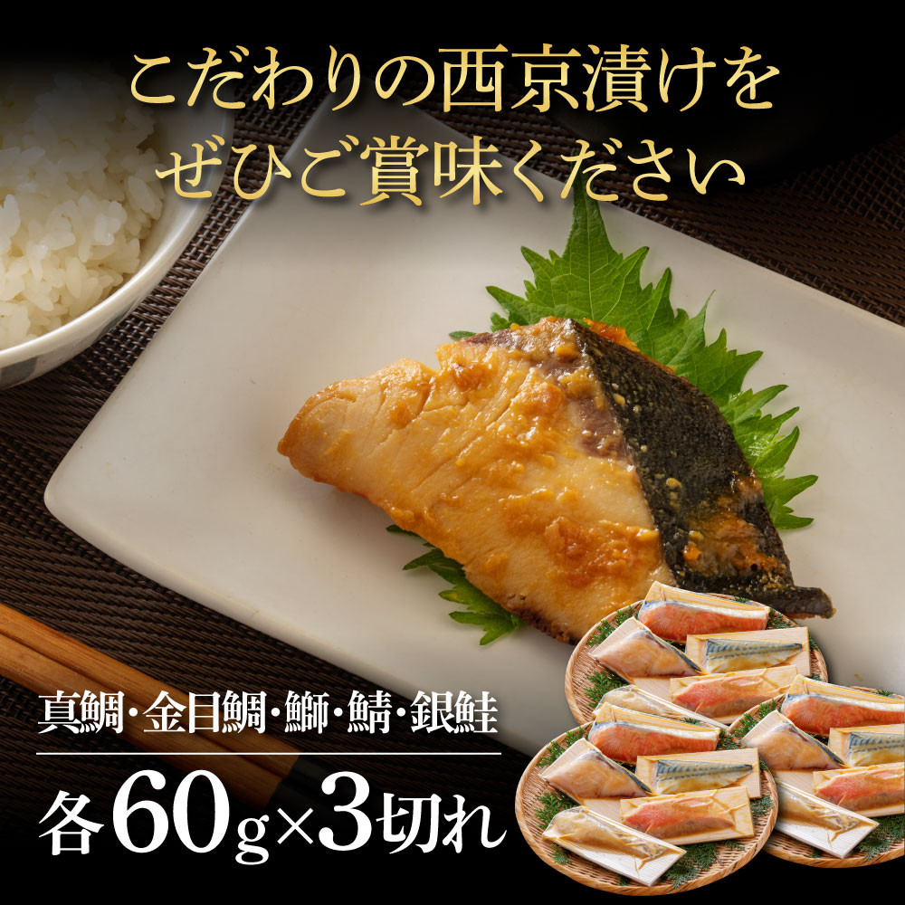 西京漬け5種(真鯛・金目鯛・鰤・鯖・銀鮭)各60g×3切れ