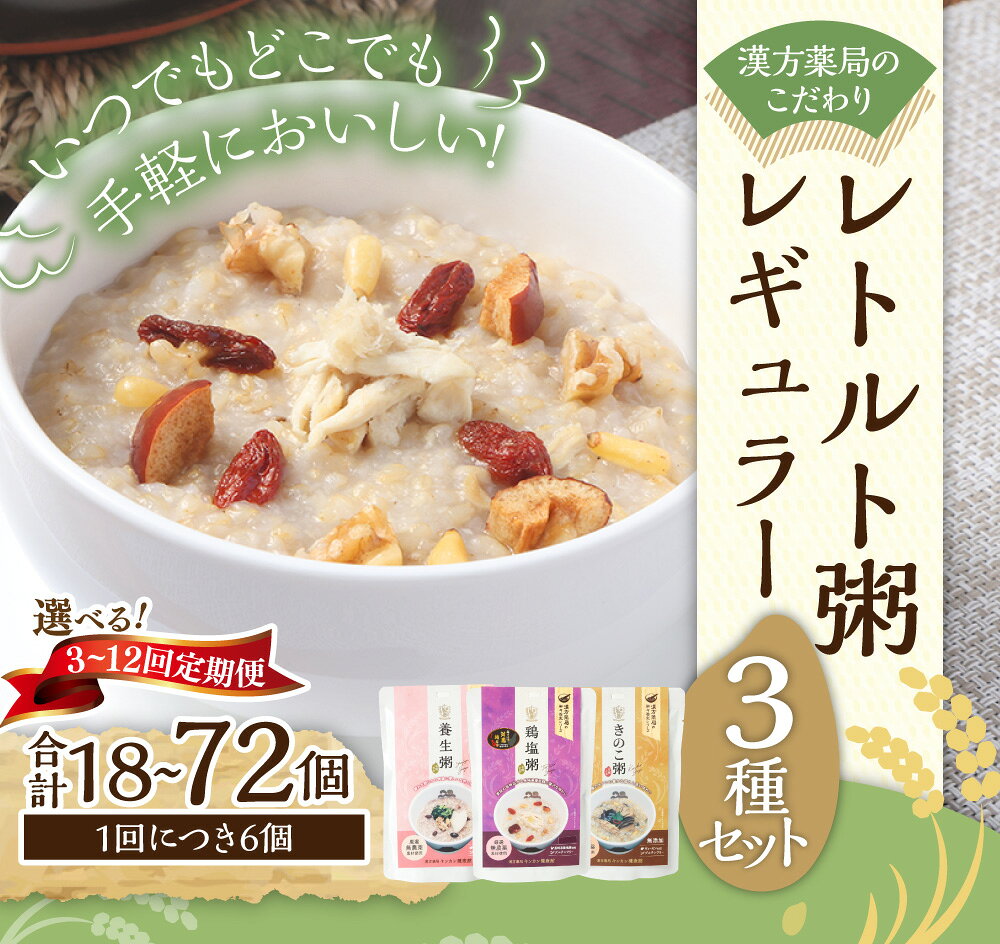 【ふるさと納税】【全3回定期便】漢方薬局のこだわりレトルト粥 レギュラー3種セット 6個×3回 計18個 養生粥 鶏塩粥 きのこ粥 おかゆ お粥 レトルト 簡単 添加物不使用 漢方 常温保存 保存食 長崎県 長崎市 送料無料
