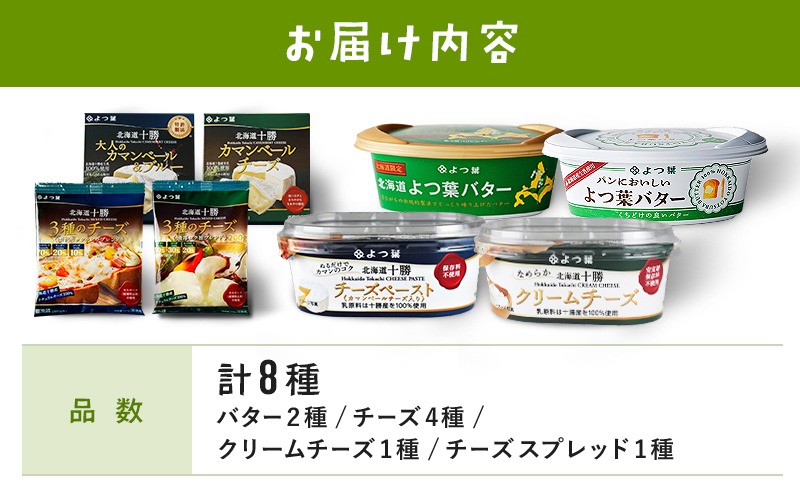- 北海道 よつ葉 チーズ バター 8個 セット 北海道限定 限定バター バター 詰合せ クリームチーズ おつまみ カマンベール ブルーチーズ モッツァレラ 食べ比べ 贈り物 お取り寄せ 詰め合わせ 乳製品 送料無料 十勝 士幌町【Y08】