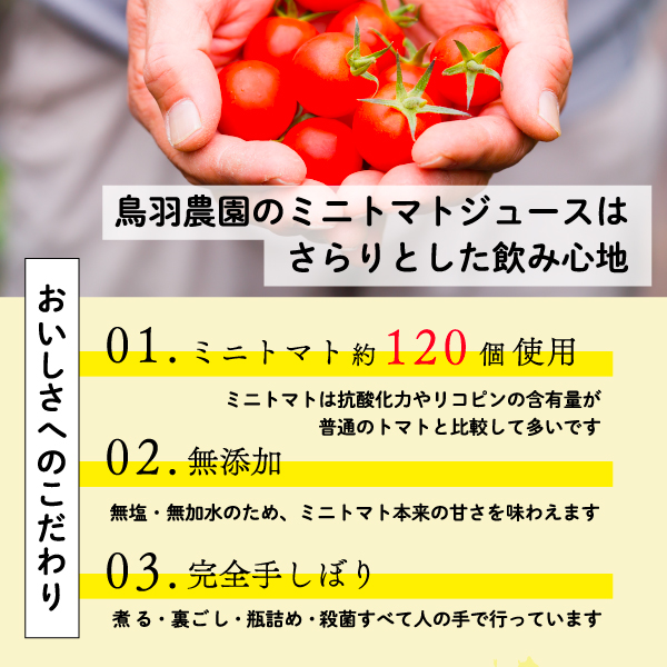 トマトジュース 北海道 手しぼり ミニトマトジュース 735g×2本 セット 鳥羽農園 ミニトマト 約120個分 無塩 無添加 国産 トマト ジュース 食塩無添加 ストレート 飲料 野菜 野菜ジュース ギフト プレゼント 贈答品 贈り物