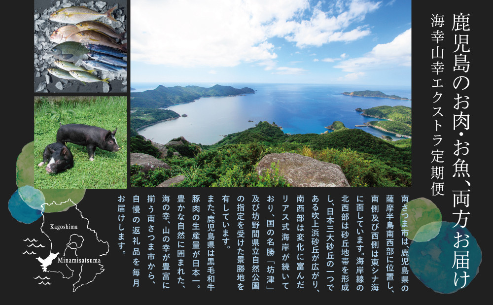 - 【定期便】海幸山幸 エクストラ厳選 定期便(全12回) お肉 お魚 豚肉 牛肉 黒豚 鹿児島黒牛 すき焼き サーロイン ステーキ しゃぶしゃぶ 角煮 鰻 蒲焼 刺身用 たかえび 薩摩甘えび 海老 マグロ さつま揚げ 焼豚 ハム レトルト ハンバーグ 出汁 鰹節