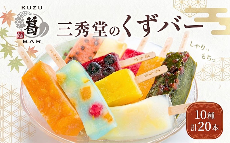 和菓子 くずバー 計20本 10種 各2本 アイス バー 手作り くず 葛 みかん 桃 抹茶 サイダー いちご マンゴー 和梨 スイカ パイナップル ブルーベリー おやつ スイーツ デザート 菓子 ギフト プレゼント 老舗 三秀堂 【 平塚市 】