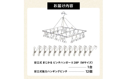 - 「安江式 まじかる ピンチハンガーⅡ 28P(Mサイズ)」1台と「安江式 強力 ハンギング ピンチ」12個のセット【岐阜県 可児市 ステンレス アイデア 便利 簡単 耐久性 新生活 洗濯 家事 タオル 靴下 国産 シンプル 洗濯バサミ ピンチ 折りたたみ 生活雑貨 丈夫 長持ち 洗濯グッズ 超軽量 職人】