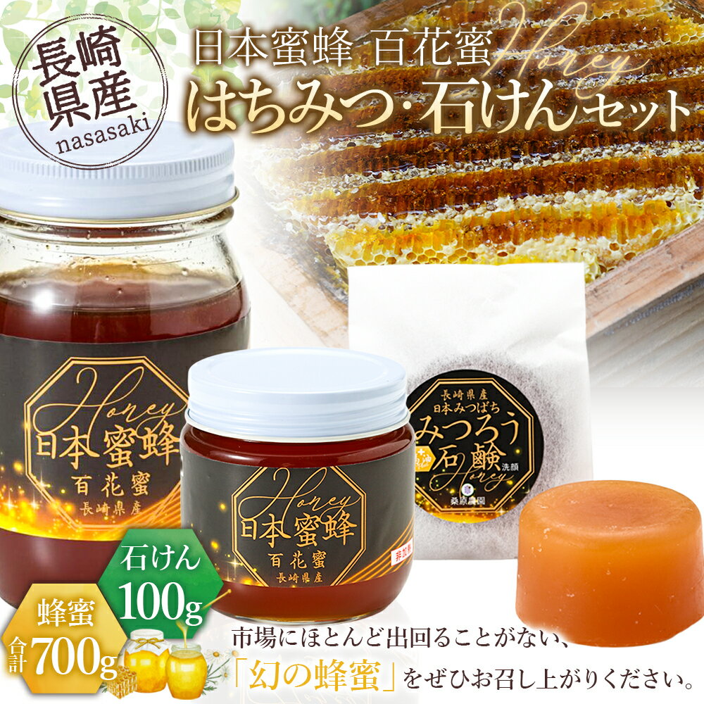 【ふるさと納税】【数量限定】日本蜜蜂百花蜜 はちみつ×2個(200g×1個・500g×1個)・石けん×1個(100g)セット 蜂蜜 ハチミツ せっけん 蜂蜜入り石鹸 ミツロウ 蜜蝋 詰め合わせ 調味料 お風呂 手洗い 洗浄 清潔 長崎県 長崎市 送料無料