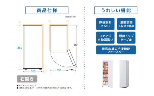 スリムでスタイリッシュな120Lの冷凍庫がもらえます。コンパクトなデザインで、幅約35.6cmと狭いスペースにも設置可能です。冷凍室はフォースターの性能を持ち、食品を約3か月間しっかり保存できます。定格電圧はAC100Vで、50/60Hzに対応。霜取装置の入力は100Wで、効率的な運転が可能です。右開きのドアで使いやすく、電源コードの長さは約1.9m。質量は約36kgで、移動も簡単です。保証期間は商品到着から1年間です。