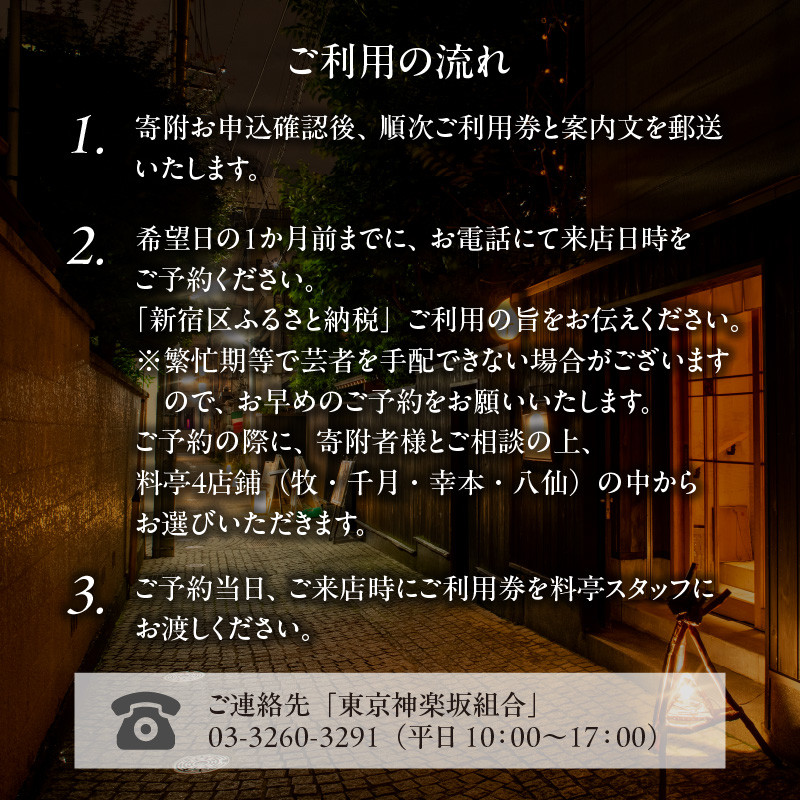 神楽坂料亭で楽しむ料理と芸者の舞(2名様夕食付き、芸者3名、お座敷体験2時間)