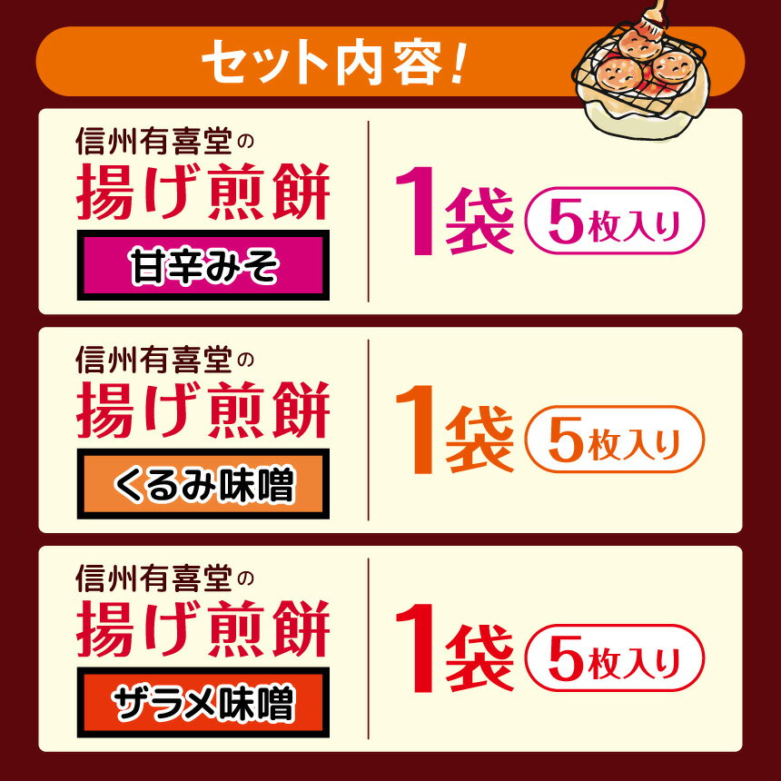 - 【 ふるさと納税 】信州有喜堂の揚げ煎餅5枚×3種セット|ふるさと納税 松本市 煎餅 お菓子 セット 贈り物 味噌 せんべい お茶 うるち米 米 餅
