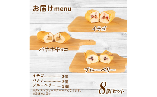 米粉 ミニクレープ グルテンフリー 8個 セット 冷凍 詰め合わせ 小分け 個包装 クレープ 菓子 スイーツ デザート お菓子 おやつ 小麦不使用 健康 フルーツ イチゴ バナナ ブルーベリー 手作り 三重 伊勢志摩 志摩