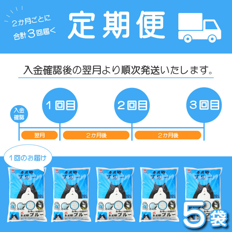 - 【ふるさと納税】《レビューキャンペーン》定期便 年3回 コーチョー ネオ砂ブルー 12L×5袋 ×3回 環境にやさしい猫砂 ねこ ネコ 銀イオン 色が変わって 後処理らくらく 抗菌 長時間消臭 再生紙 トイレに流せる ペット 日用品 防災 備蓄 富士市 [1701]