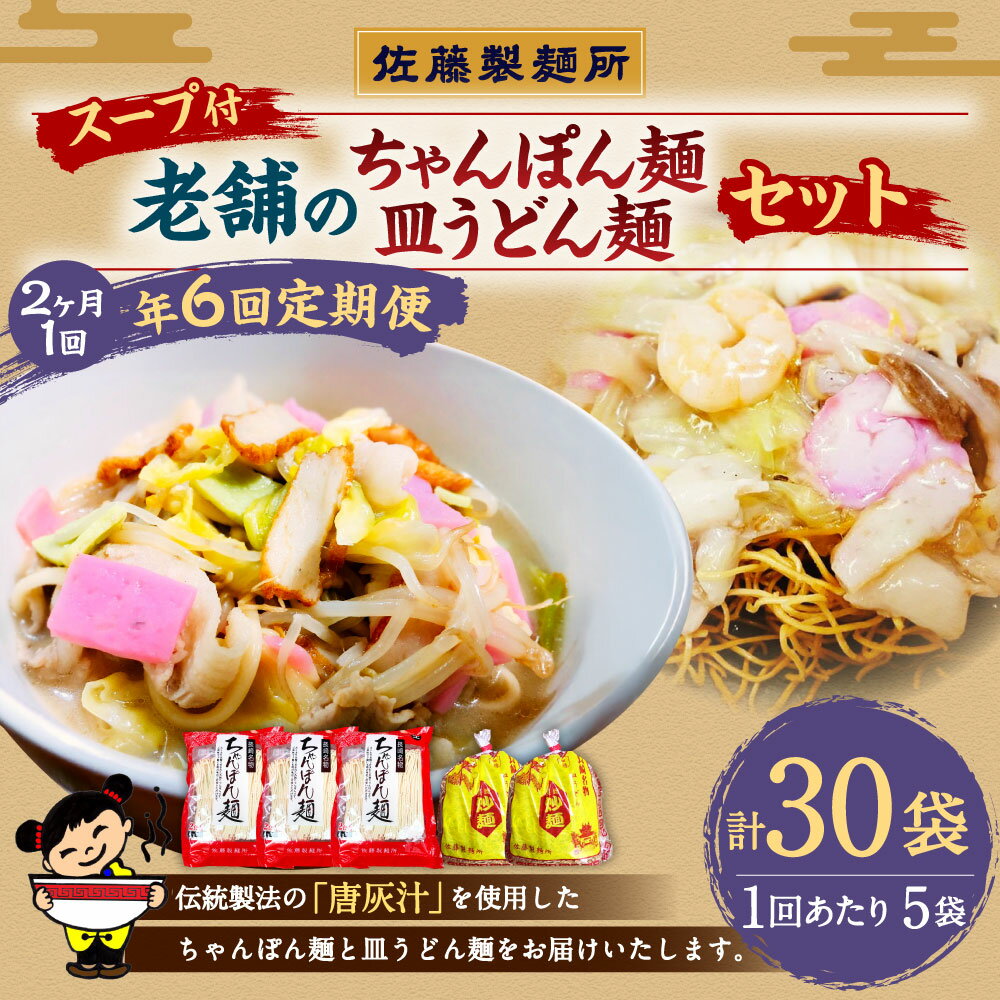 【ふるさと納税】【年6回定期便】老舗の「長崎ちゃんぽん麺」「長崎皿うどん麺」セット スープ付き! ちゃんぽん×3袋 皿うどん×2袋 2人前 各100g チャンポン 揚麺 揚げ麺 唐灰汁 とうあく 麺類 簡単調理 グルメ 長崎県 長崎市 送料無料