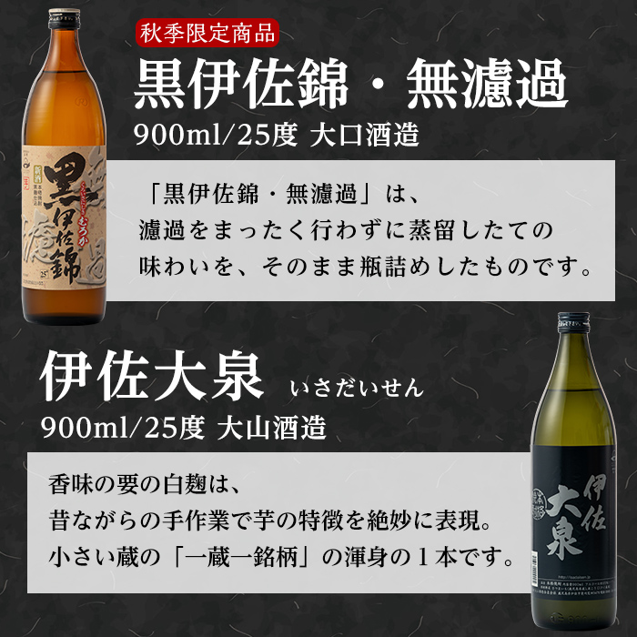 A4-09 《数量限定》無濾過と楽しむ伊佐の名酒セット!黒伊佐錦 無濾過、伊佐美、伊佐大泉(900ml×2本・720ml×1本・計3本) 季節限定の芋焼酎の新酒『無濾過』をお届け【平酒店】