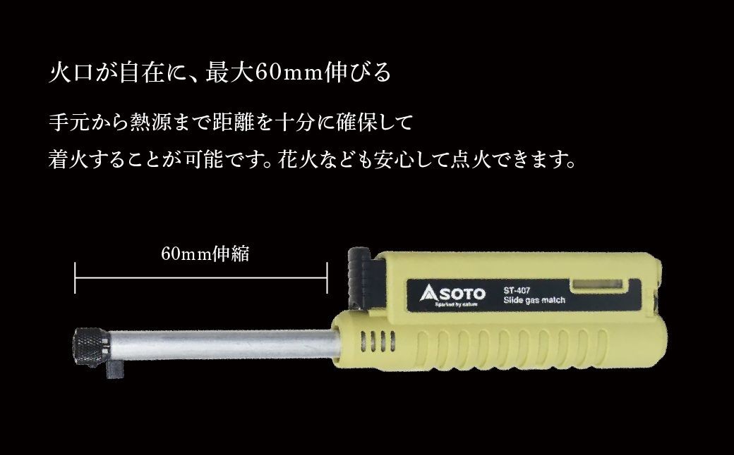- 【SOTO】スライドガスマッチ ST-407LV | 埼玉県 上尾市 バーナー 強力バーナー 料理 防災 防災グッズ 地震 キャンプ アウトドア 新富士バーナー SOTO ソート 使い捨てライター 炎温度約1,300℃ 趣味 模型づくり ハンダ付け 花火 線香 着火 持ち運び 軽い 軽量 アウトドアグッズ キャンパー 炙り料理 手料理 プロ 充てん式