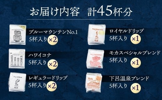 - ドリップコーヒーアソート45杯分(ブルーマウンテンNo1 5杯×2、ハワイ・コナ 5杯×2、レギュラーブレンド5杯×2、ロイヤルブレンド5杯、モカ・スペシャルブレンド5杯、下呂温泉ブレンド5杯)コーヒー 珈琲 ドリップ 下呂温泉 緑の館 ドリップバック 下呂市
