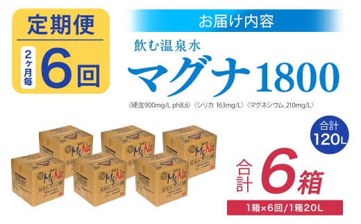 - 【2ヶ月毎6回定期便】硬水ミネラルウォーターマグナ1800 20L コック付き 計6箱 (1箱×6回) 水 飲料 長湯温泉水