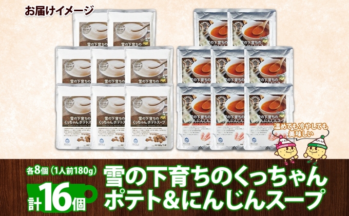 - 北海道産 雪の下育ちのくっちゃんポテト&にんじんスープ 180g×各8個 小分け 個包装 レトルト スープ ポタージュ じゃがいも ニンジン 野菜 朝食 夜食 常備食 送料無料 北の百貨 しりべしや ニセコ 北海道 倶知安町 加工食品 惣菜