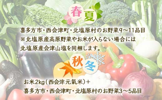 - 《定期便》<3市町村共通返礼品>会津の恵み野菜セット(大)《全12回》 朝採れ 野菜 お米 精米 米 セット 詰合せ 契約農家 朝採り 採れたて 新鮮 会津野菜 定期便 12回 12ヶ月 連続 F4D-1416