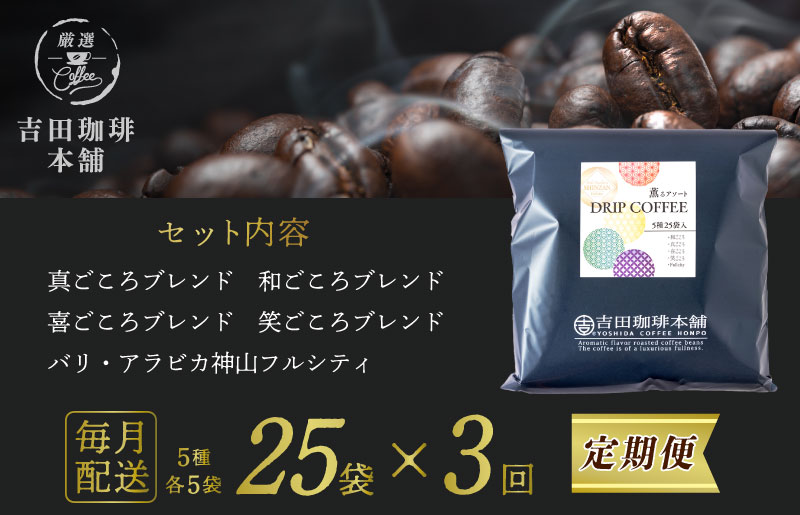 - 099Z142 ドリップコーヒー 5種25袋 定期便 全3回【毎月配送コース 珈琲 こーひー コーヒー 自家焙煎 オリジナル ギフト キャンプ アウトドア 家計応援】