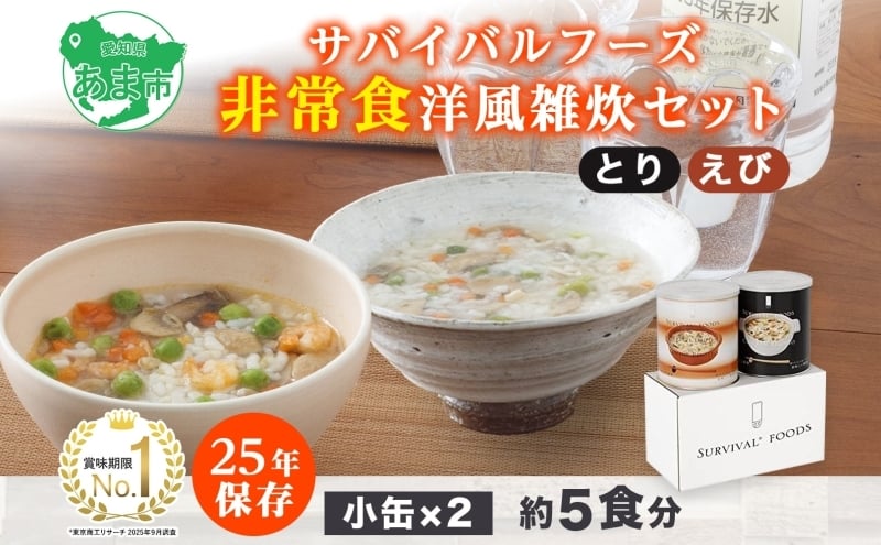 - 賞味期限25年 非常食 洋風 雑炊 セット 小缶詰合せ 約5食分 缶切り付 サバイバルフーズ とり えび 災害対策 フリーズドライ 備蓄 保存食 長期保存 防災食 常温保存 非常用食品 災害食 防災グッズ 国内製造 送料無料 セイエンタプライズ 愛知県 あま市