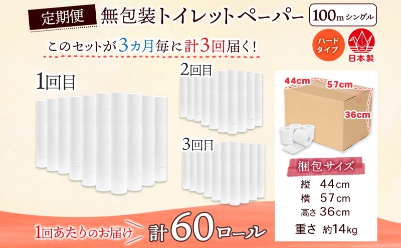 定期便 3ヶ月毎 全3回 無包装 トイレットペーパー シングル ハードタイプ 100m 60ロール 長巻き 紙ペーパー エコ 日用品 消耗品 トイレ用品 114mm幅 非常用 備蓄 ストック まとめ買い 防災 国産 日本製 送料無料 川一製紙 岐阜県 美濃市