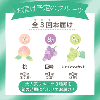 - <発送月固定定期便>山梨県産旬のおいしいフルーツ<桃・巨峰・シャインマスカット>定期便 全3回_ フルーツ くだもの 果物 もも ぶどう 定期便 産地直送 贈答 ギフト 旬 季節限定 送料無料 セット 【4013020】