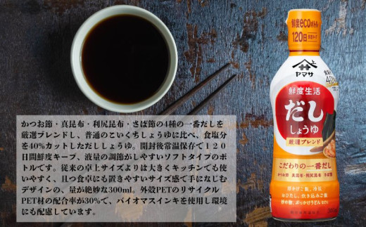 - ヤマサだししょうゆ 12本(1本300ml) しょうゆ 醤油 しょう油 鮮度生活 調味料 家庭用 おかず 料理 グルメ お刺身 お寿司 冷奴 焼き魚 老舗 リピート 人気 おすすめ 贈答 ギフト 贈物 贈り物 送料無料 ヤマサ ヤマサ醤油 生しょうゆ 生醤油 麹 麹醤油 熟成 国産 千葉県 銚子市 大豆 櫻井謙二商店