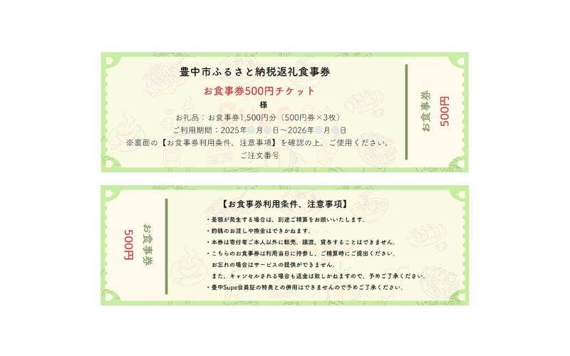 - 豊中飲食チケット! 1,500円分(500円券×3枚)
