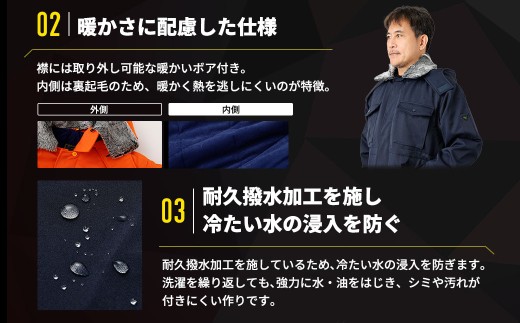 - No.1033-03 【-30℃に耐える】冷凍倉庫用防寒コート7300(オレンジ/LL) / ロングセラー商品 高級 中綿シンサレート 保温性 フード 起毛 暖かい 広島県
