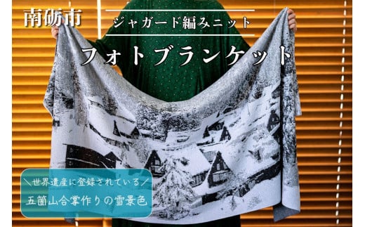 五箇山合掌造りの雪景色をジャガード編みで表現したニットブランケット【約190cm×約70cm】