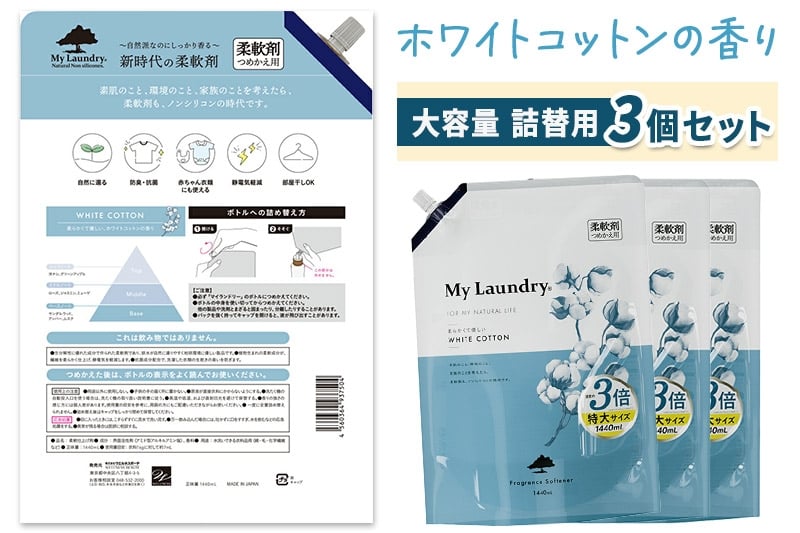 - 《定期便7ヶ月》ノンシリコン柔軟剤 マイランドリー 詰替用 大容量(1440ml×3個)【ホワイトコットンの香り】
