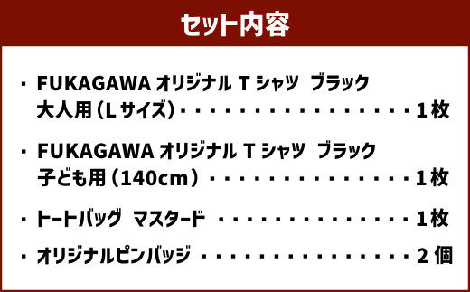 【大人:Lサイズ×子ども:140サイズ】FUKAGAWAオリジナルTシャツ ブラック(大人用・子ども用)・トートバック・オリジナルピンバッチ2個セット シャツ Tシャツ 服 ピンバッチ バック トートバッグ マスタード 北海道 深川市