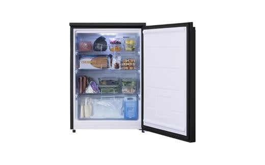 奥行きがスリムな66Lの冷凍庫がもらえます。ブラックカラーでスタイリッシュなデザインが特徴です。冷凍室はフォースターの性能を持ち、食品を約3か月間保存可能です。幅約55.2cm、奥行約39cm、高さ約80cmとコンパクトで、狭いスペースにも設置しやすいです。年間消費電力量は256kWhで、省エネ設計が魅力です。右開きのドアで使いやすく、トップテーブルは耐熱温度約80℃、耐荷重約25kgと実用的です。電源コードは約2.3mで、設置場所を選びません。