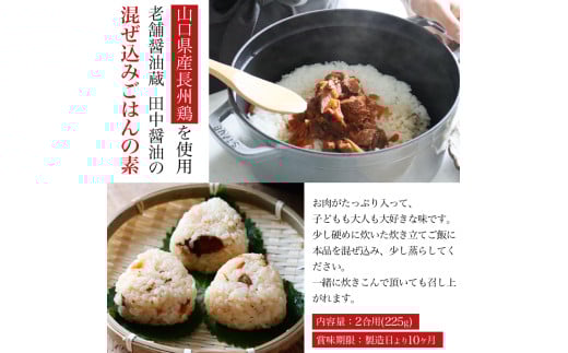 鶏飯 まぜご飯のもと 225g×4 2合用 ( 米 ご飯 混ぜご飯 混ぜご飯の素 混ぜ込みご飯 炊き込みご飯 ご飯の素 鶏 長州鶏 鶏めし まぜ鶏 鶏飯の素 加工品 レトルト 簡単 調理 手軽 時短 グルメ 弁当 ご飯のお供 非常食 保存食 備蓄 プレゼント ギフト 贈り物 贈答 お中元 お歳暮 記念日 父の日 母の日 ) 老舗醤油蔵 田中醤油 下関 山口