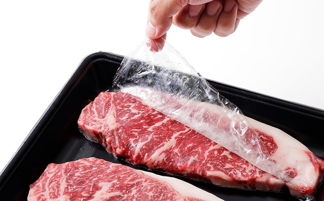 ハーブを混ぜたエサを食べて育った「十勝ハーブ牛」のサーロインステーキ用肉です。ほどよいサシが入った美味しいお肉を、伸縮性のあるフィルムを密着させる「スキンパック包装」でパッキング。従来の真空包装に比べてドリップが出にくいので旨味を逃さず、ご自宅でもおいしいお肉が楽しめます。