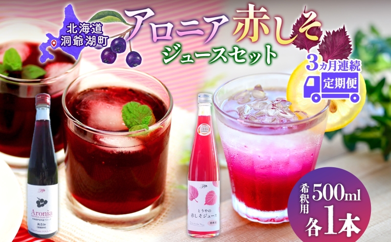 定期便 連続3回 北海道産 赤しそジュース アロニアジュース 500ml 各1本 希釈用 赤しそ アロニア 果汁 ジュース ドリンク 飲料 飲み物 フルーツ しそ シソ 紫蘇 贈答 詰め合わせ お取り寄せ 送料無料 ピュアフーズとうや 北海道 洞爺湖町