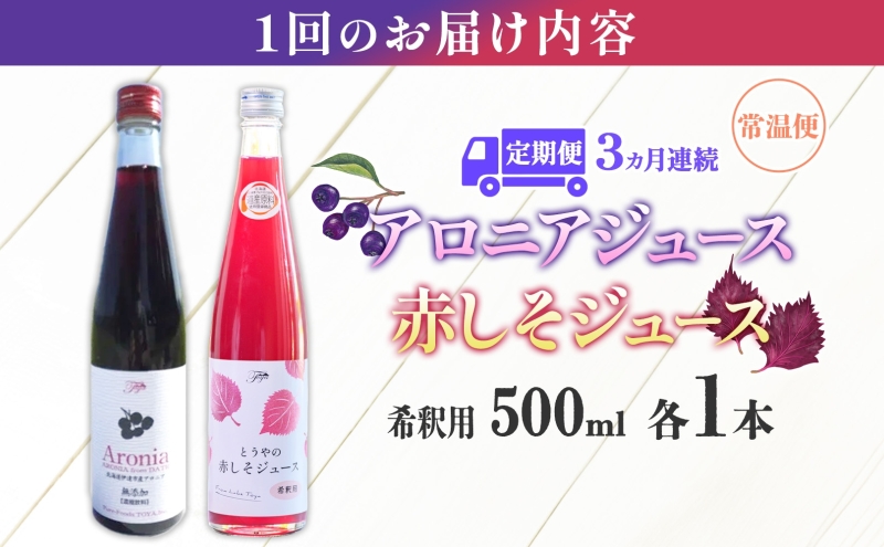 - 定期便 連続3回 北海道産 赤しそジュース アロニアジュース 500ml 各1本 希釈用 赤しそ アロニア 果汁 ジュース ドリンク 飲料 飲み物 フルーツ しそ シソ 紫蘇 贈答 詰め合わせ お取り寄せ 送料無料 ピュアフーズとうや 北海道 洞爺湖町