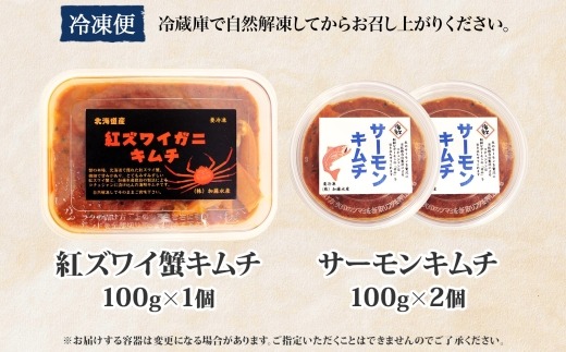 3206. 紅ズワイ蟹 キムチ 100g サーモン キムチ 100g×2個 カニ かに 蟹 鮭 生食可 海鮮 ピリ辛 紅 ズワイガニ 紅ずわい蟹 おかず ご飯のお供 おつまみ 酒の肴 送料無料 北海道 弟子屈町