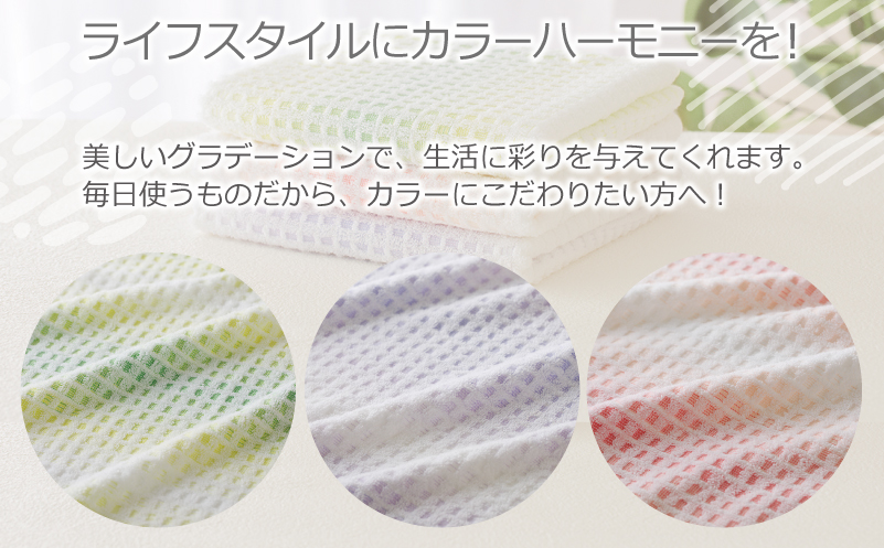 - グラデーションワッフル フェイスタオル 6枚(ピンク/グリーン/パープル)泉州こだわりタオル【泉州タオル 国産 吸水 普段使い シンプル 日用品】 010B1558