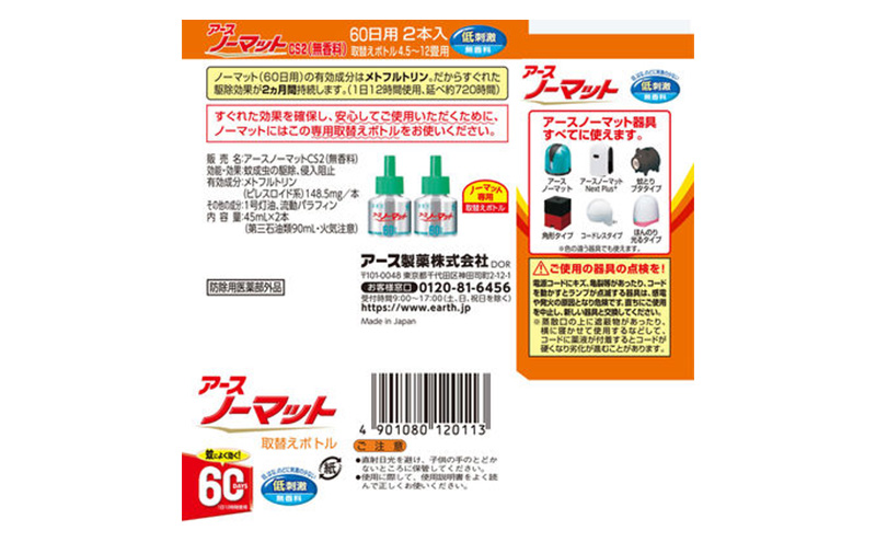 - ノーマット 取替ボトル60日1セット(2本×2箱) アース 蚊よけ 蚊対策 蚊退治 蚊に効く蚊駆除 侵入防止 低刺激 無香料 取り替え 取替 本体