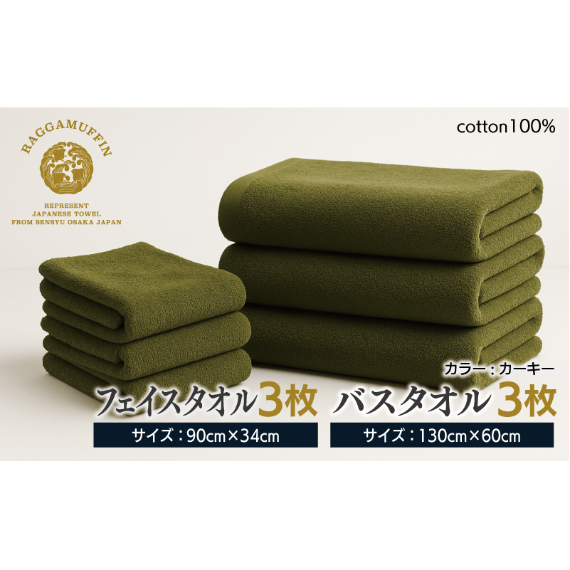 高級泉州タオル ラガマフィン バスタオル フェイスタオル カーキー 合計6枚(3枚×2種)【国産 日用品 上質 タオル 国内製造】 099H2480